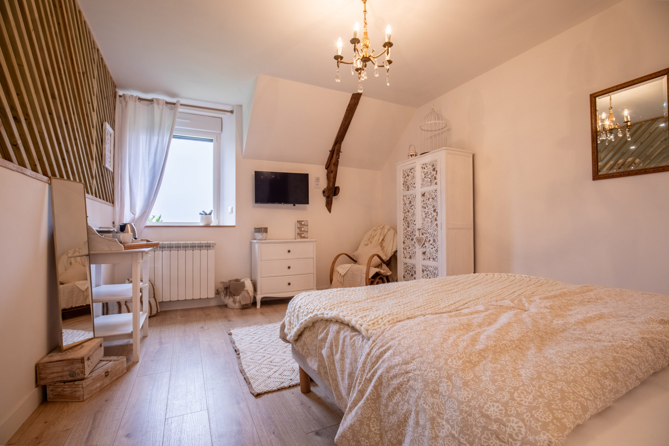 Cette chambre, soigneusement décorée, vous offre une atmosphère chaleureuse et réconfortante, parfaite pour un séjour relaxant.