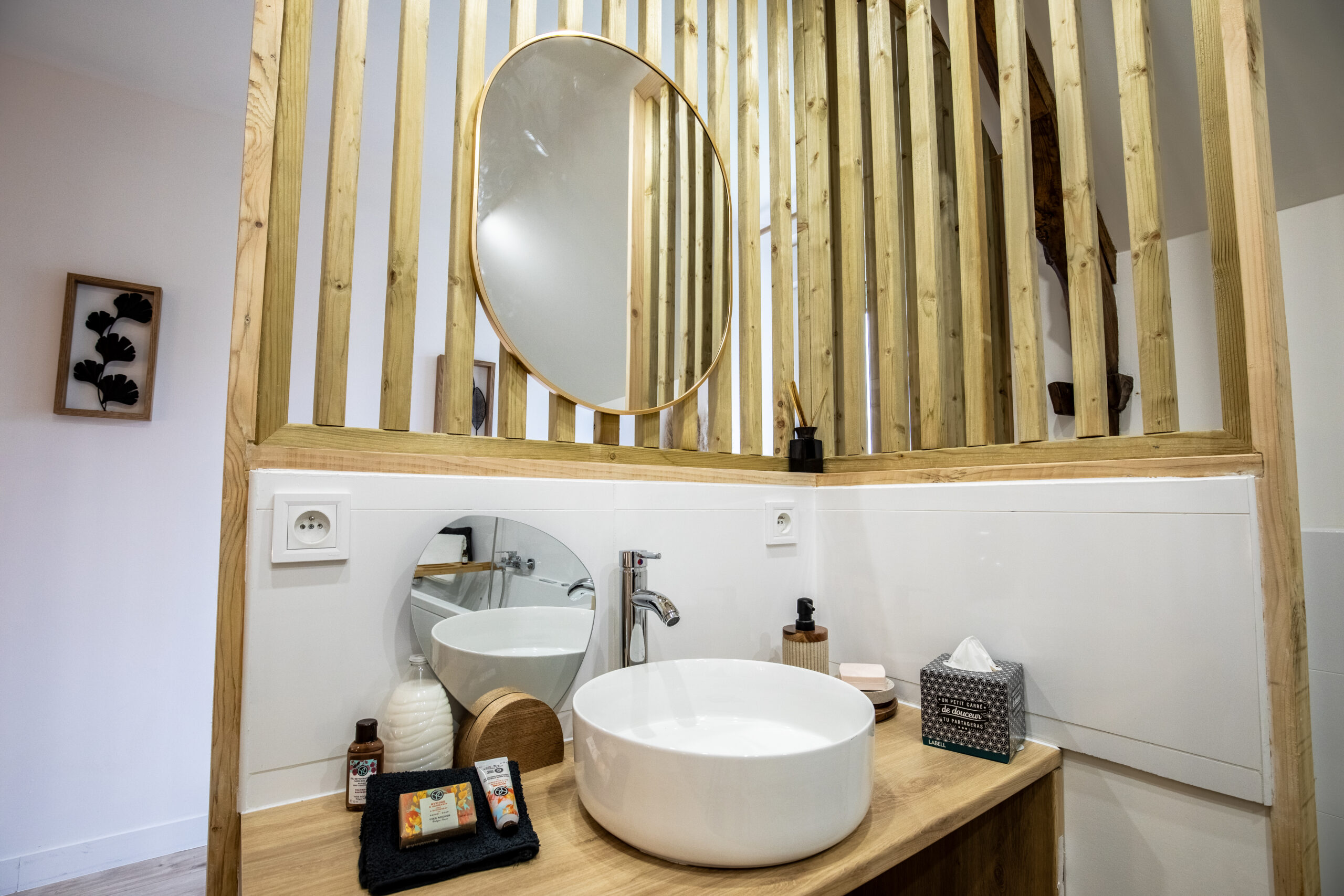 Son ambiance apaisante est renforcée par le mobilier en bois blanc apportant une touche de charme discret à l’espace.
