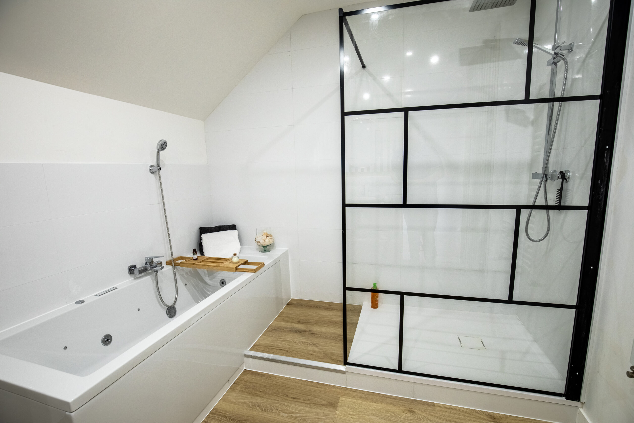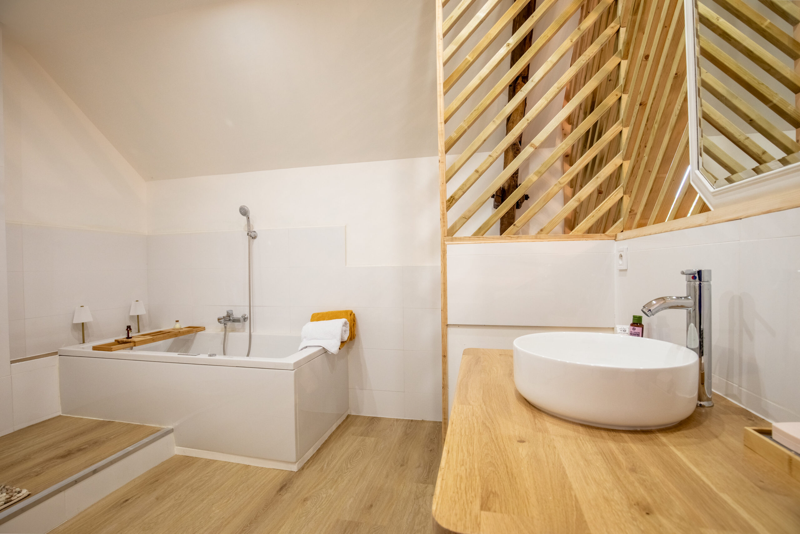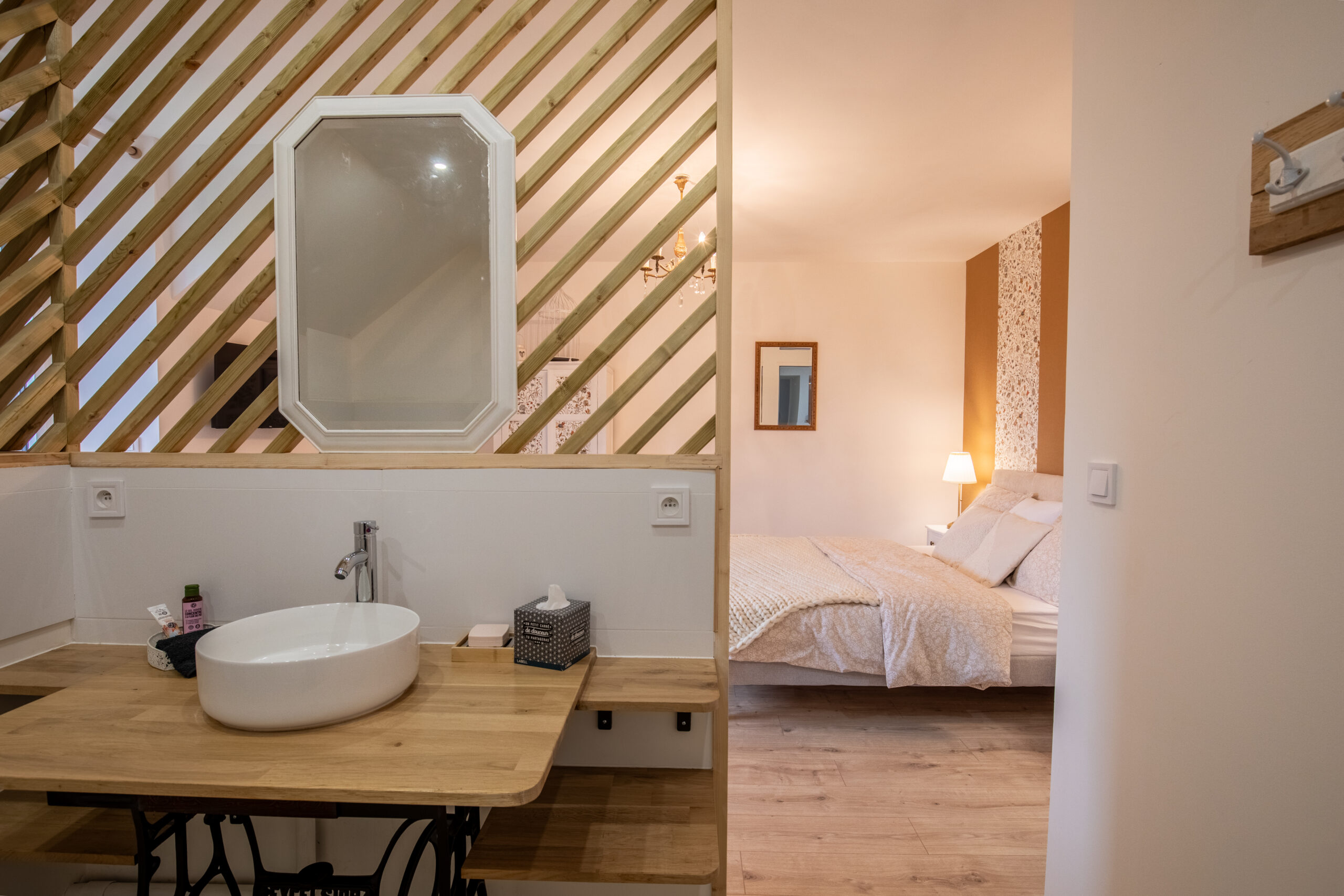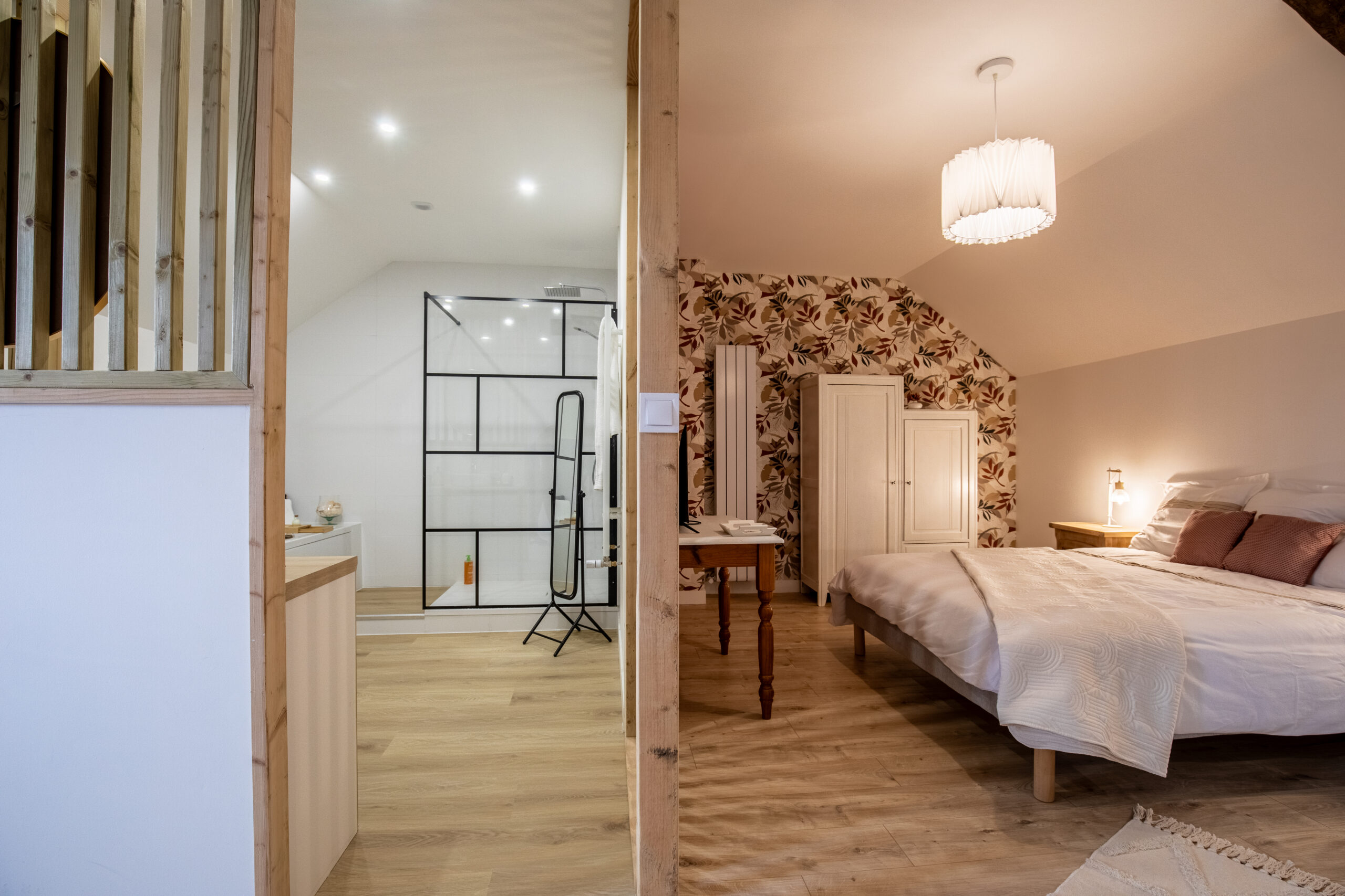 La chambre dispose également de rangements pratiques pour faciliter votre séjour. De plus, vous profiterez d’une salle de bain privative équipée d’une douche, d’une baignoire balnéo et de WC, vous offrant ainsi un confort optimal.